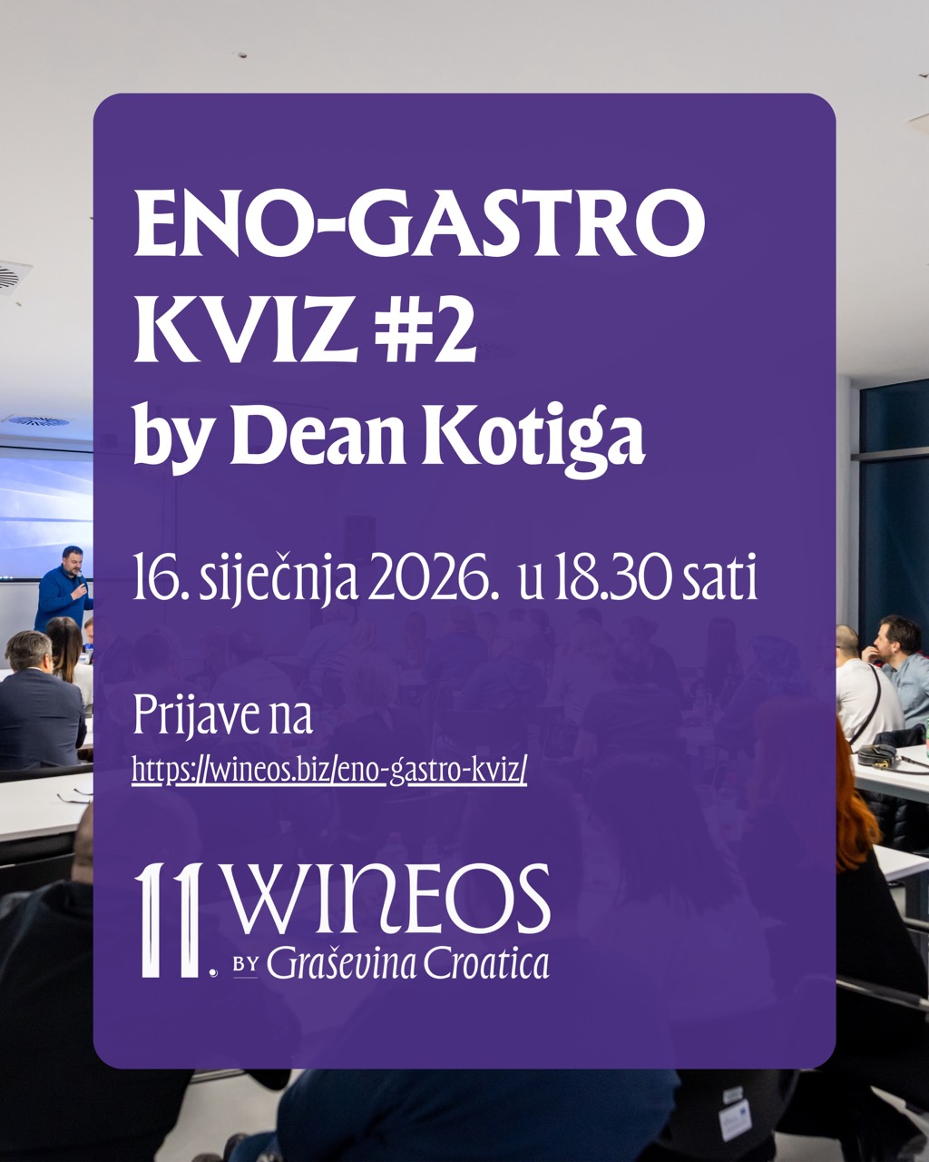 Eno-gastro kviz održat će se prvoga dana sajma WineOs by Graševina Croatica, u petak, 16. siječnja 2026. u 18:30 sati, u Gospodarskom centru Osječko-baranjske županije. Zbog iznimnog interesa na prethodnom izdanju, broj ekipa povećan je na 30, pa je ovo idealna prilika da okupite svoju ekipu i okušate se u kvizu gdje se znanje o vinima, gastronomiji i općoj kulturi isprepliće s brzim razmišljanjem i dobrom dozom humora.